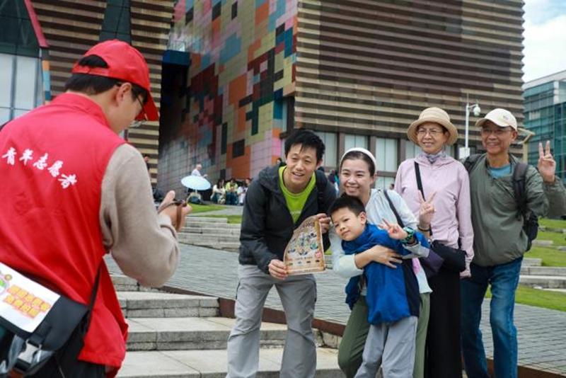 上海游客赵舒舒一家在贵州省博物馆打卡拍照。