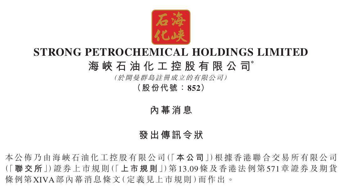 10月17日晚间,海峡石油化工公告称,10月15日,公司间接全资附属公司海峡石油化工有限公司(下称“海峡香港”)对海峡香港前董事姚国梁先生及谭笑先生向香港特别行政区高等法院提交传讯令状,指称被告人于海峡香港于2024年末与外部订约方进行之有关原油买卖交易中违反其对海峡香港所负之受信、普通法及╱或法定责任,要求被告人向海峡香港偿付其于所指称之交易中所蒙受之损失及损害,金额约为人民币3700万元。
