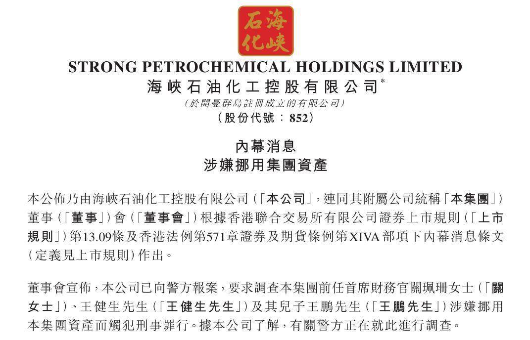 2024年12月26日晚间,海峡石油化工公告称,公司已向警方报案,要求调查本集团前任CFO关珮珊女士、王健生先生及其儿子王鹏先生涉嫌挪用本集团资产而触犯刑事罪行。有关警方正在就此进行调查。